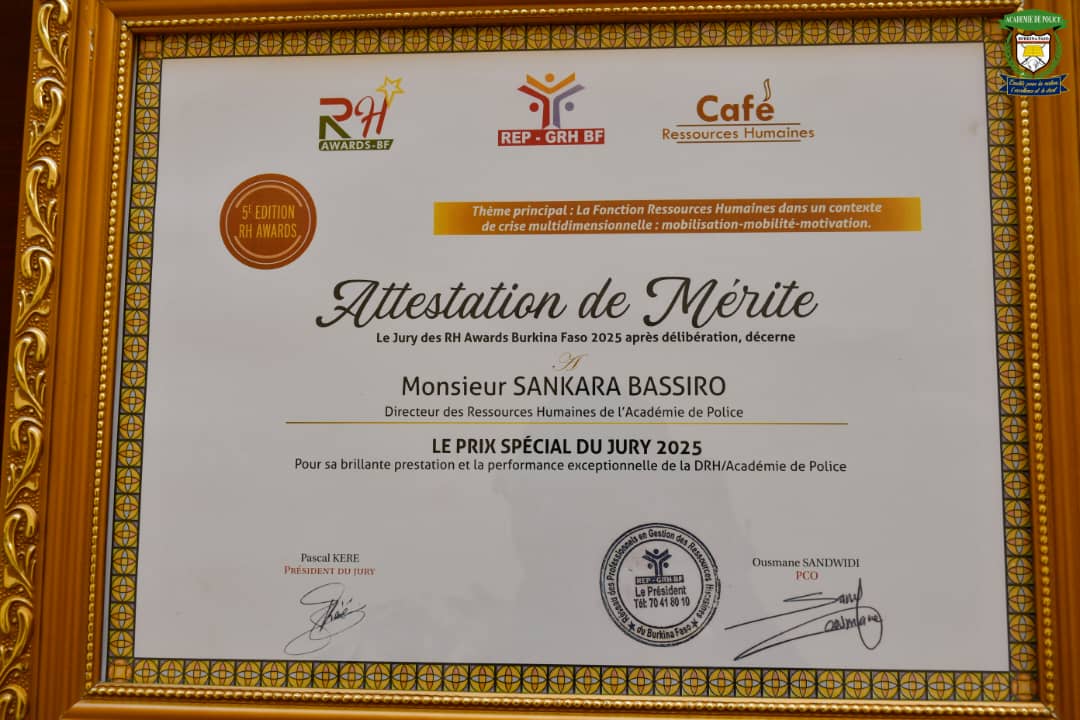 En effet, le Commissaire de police SANKARA Bassiro, Directeur des Ressources Humaines (DRH) de l’Académie, a reçu les prix du Meilleur DRH des établissements publics de l’État (EPE), ainsi que le prix spécial du jury. Cette nomination vient couronner son engagement, son professionnalisme et sa contribution à la quête de l'excellence de l’AP en matière de gestion du personnel.